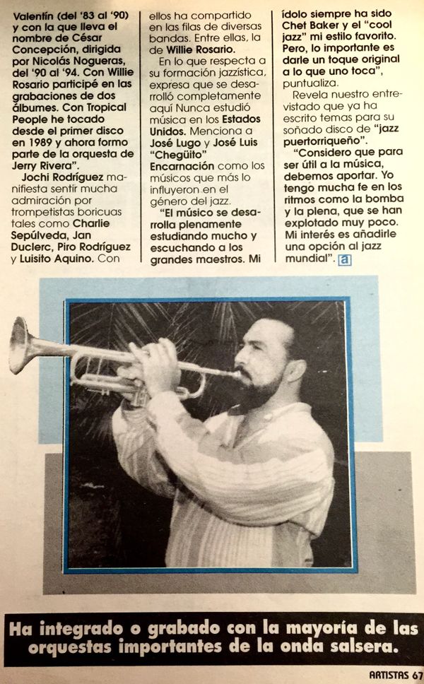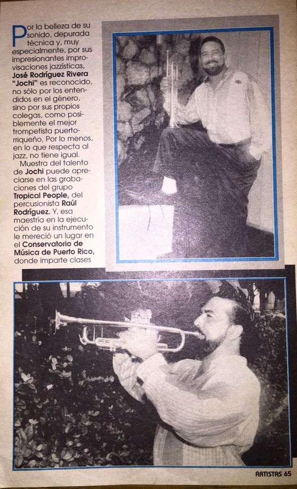 Jose “Jochy” Rodriguez is a Puerto Rican professional musician and passionate painter whose love of art as an expression of the soul permeates through his work. He was trained in the Puerto Rico Conservatory of Music, where he obtained Bachelors’ Degree, in music education and trumpet. During his 40 years of carreer as a proffesional trumpet payer, he has played and recorded with many Latin music and "salsa" well known artists like Bobby Valentin, Willie Rosario, Jerry Rivera, Ismael Miranda, Ismael Rivera, and many more.